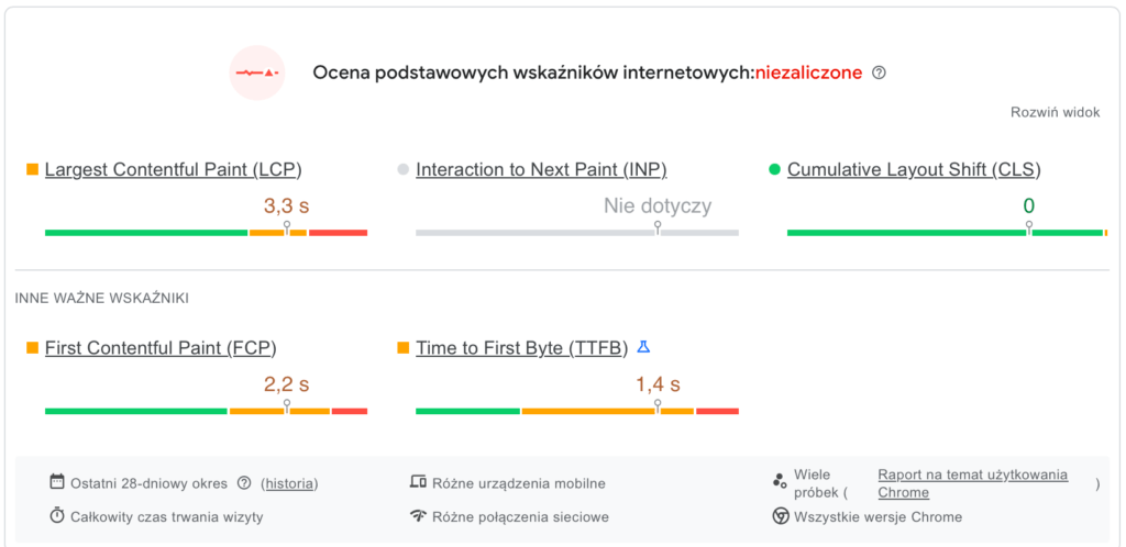 - Field Data (Dane terenowe): to one w dużej mierze decydują o rankingu (Core Web Vitals). Pochodzą z raportu CrUX (Chrome User Experience Report). Reprezentują ostatnie 28 dni doświadczeń rzeczywistych użytkowników na ich rzeczywistych urządzeniach i połączeniach sieciowych. Jeśli tutaj widzisz problemy, Twoja strona może tracić przewagę nad konkurencją w wynikach wyszukiwania – nawet jeśli wynik Performance Score w danych laboratoryjnych świeci na zielono.