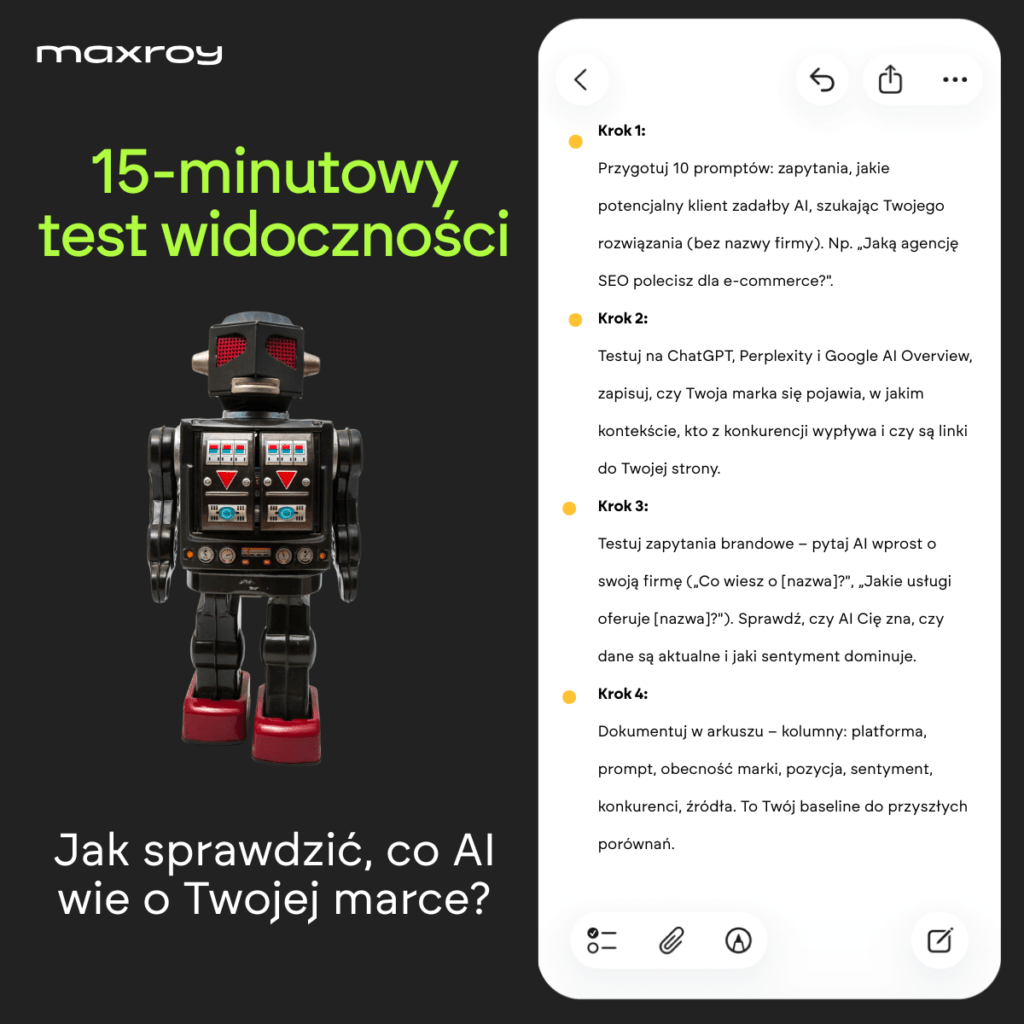 Zanim zainwestujesz w płatne narzędzia, sprawdź samodzielnie, jak AI postrzega Twoją markę. Potrzebujesz dostępu do trzech platform i kwadrans czasu.