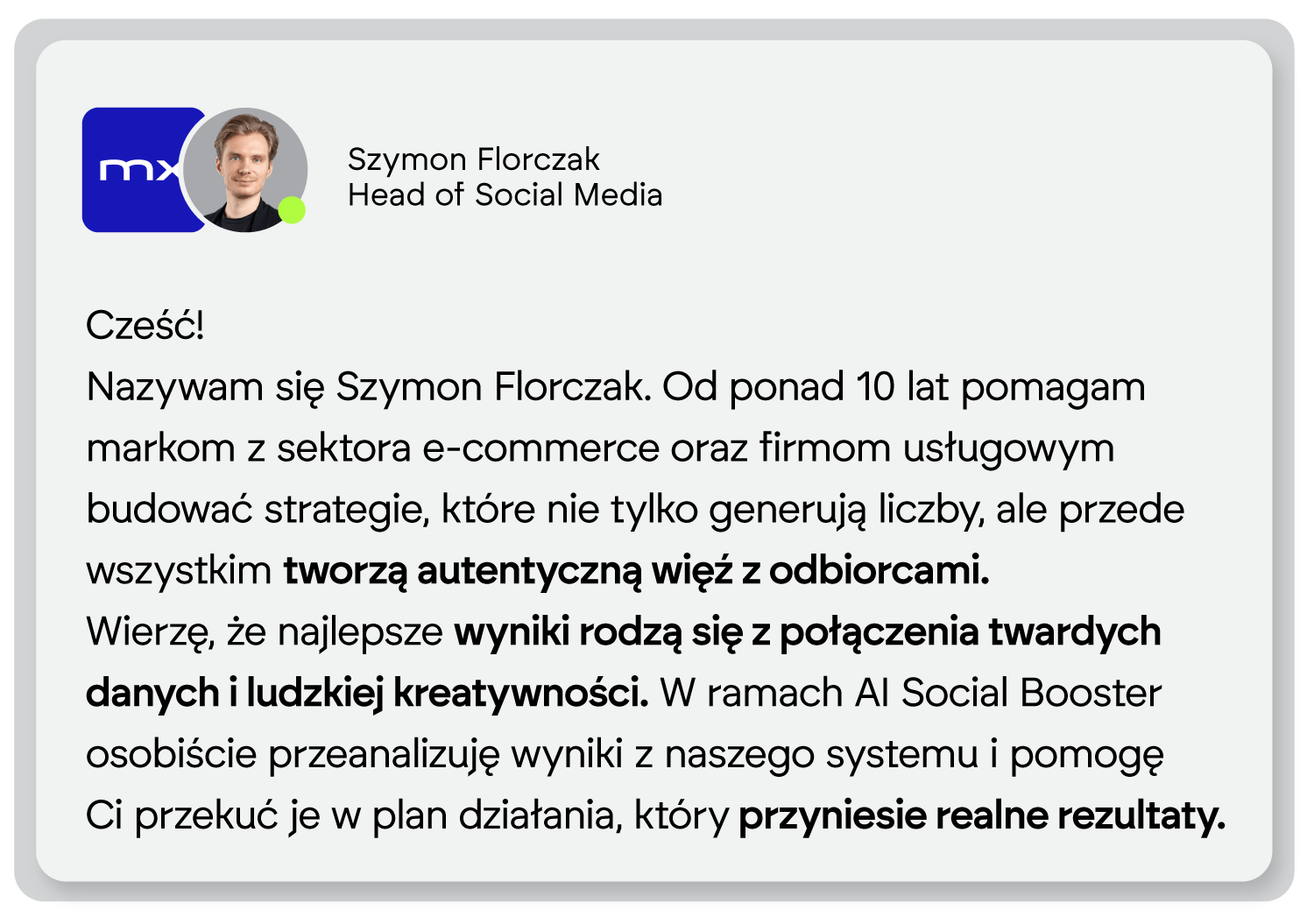 Technologia to nie wszystko. Każdy pakiet AI Social Booster jest finalizowany i omawiany z Tobą przez doświadczonego stratega maxroy. To on nadaje danym ludzki kontekst i dba o to, by strategia była nie tylko mądra, ale i obfitująca w emocje budujące relacje z Twoimi użytkownikami.